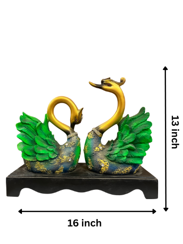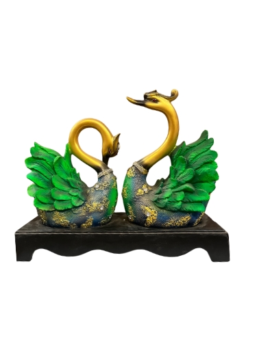Add a touch of elegance and romance to your home with the Royal Swan Couple Showpiece, a stunning piece of handcrafted art symbolizing love, harmony, and togetherness. Sculpted with exquisite detail and finished in rich shades of emerald green and gold, these graceful swans rest on a solid black wooden base, making them a striking addition to any space.