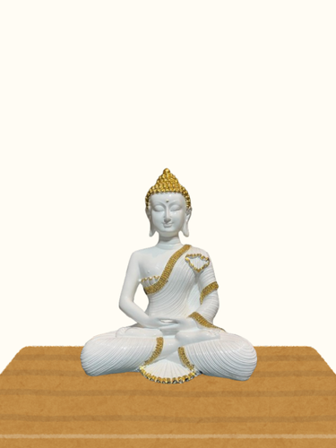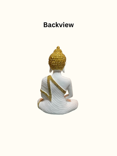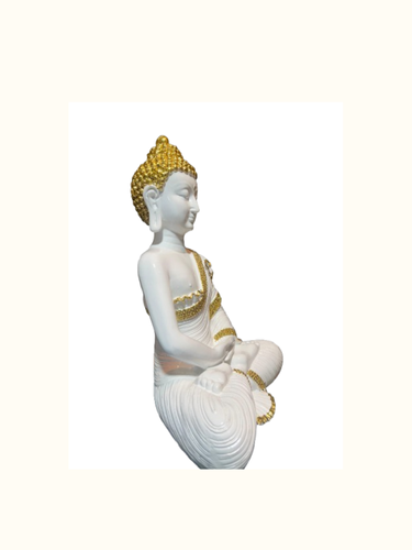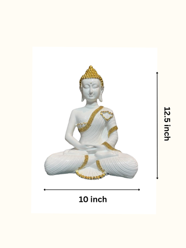 Enhance your space with this Serene White & Gold Buddha Idol, crafted from high-quality polished stone and designed to infuse your home with tranquility and elegance. Measuring 12.5 inches in height and 10 inches in width, this beautifully sculpted piece features intricate gold detailing on a smooth white base, reflecting both peace and sophistication.